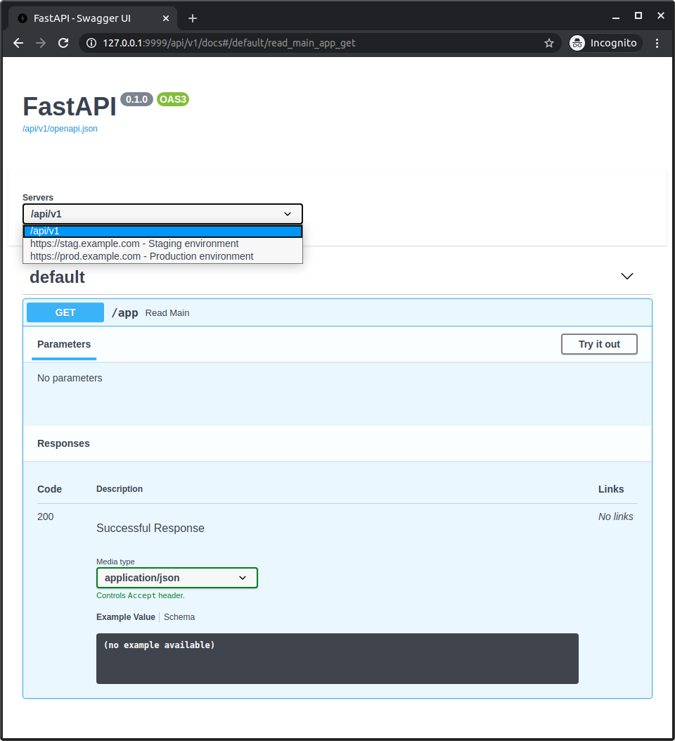 Обратите внимание на автоматически добавленный сервер с url равным /api/v1, взятым из root_path.
