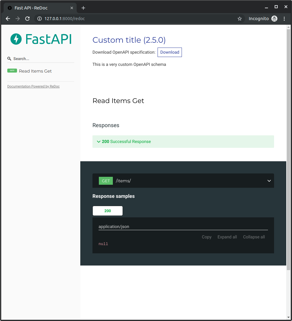Например, добавим расширение OpenAPI ReDoc для включения собственного логотипа.